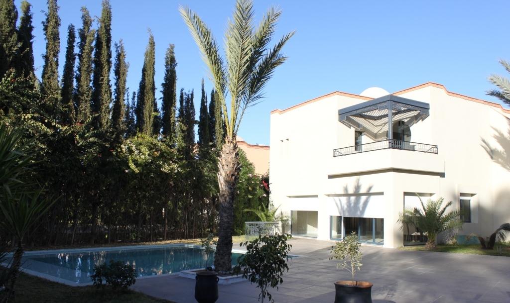 villa contemporaine neuve 4 ch. a vendre jolie villa indépendante avec piscine à qlq min. du golf d'amelkis. terrain de 900 m². construction de 430 m². 4 chambres à coucher, 4 sdb, salon sam, cuisine équipée. endroit très calme et sécurisé. visites sur rdv. intermédiaires sÂ’abstenir